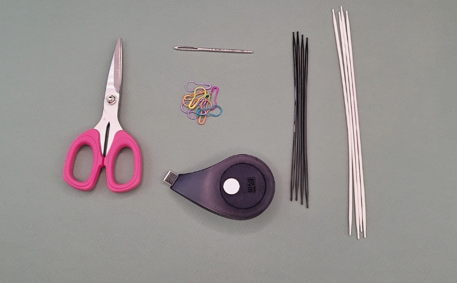 Des Weiteren braucht ihr noch eine Wollnadel*, ein Maßband*, eine Schere* und einen Maschenmarkierer*.