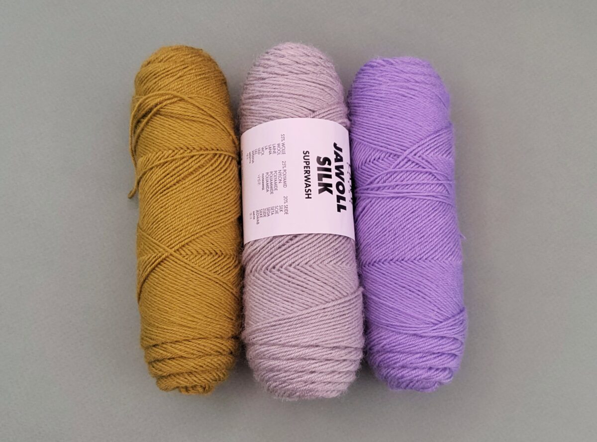 Es ist eine klassische Sockenwolle mit der Lauflänge von 210 m pro 50 g. Die beiden Farben Senf, Nr. 150 und Lila, Nr 246, bestehen aus 75% Schurwolle und 25% Polyamid. Das Grau, Nr. 123, ist eine Seidenqualität und besteht aus 55 % Schurwolle, 25% Polyamid und 20% Seide.