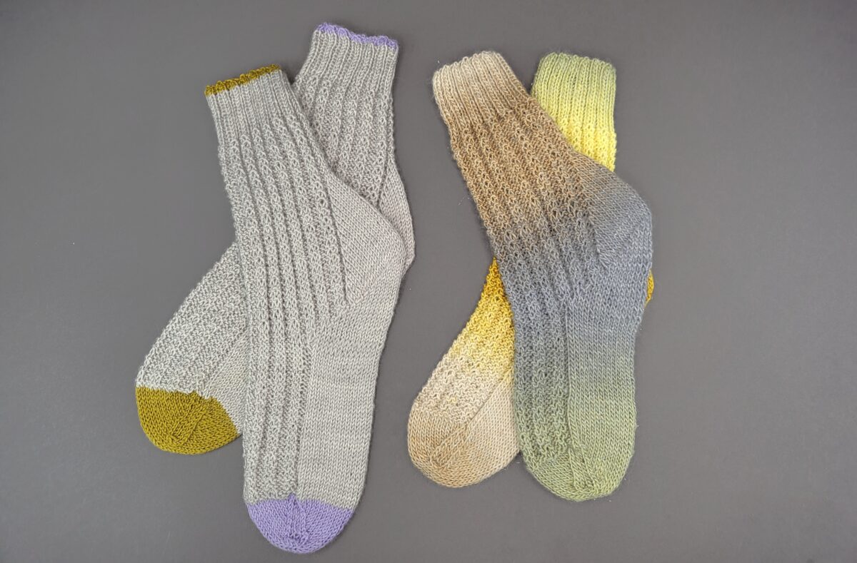 Ein wenig sommerlich ist mein Sockenpaar diesmal geworden; Im Hauptanteil des Garnes ist Seide mit verarbeitet. Und dieser wundervolle Naturstoff hält die Temperatur des Körpers angenehm. Seide schließt nämlich nicht die Wärme ein, wie Wollfasern. Bedeutet, der Körper überheizt nicht, kühlt aber auch nicht ab.