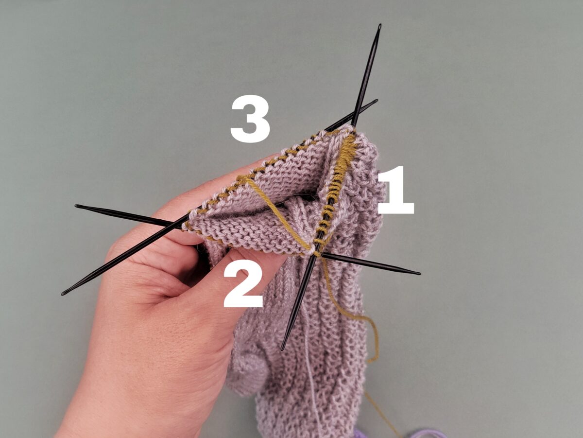 Für die Zunahmeferse teilt ihr die Maschen wie folgt auf.