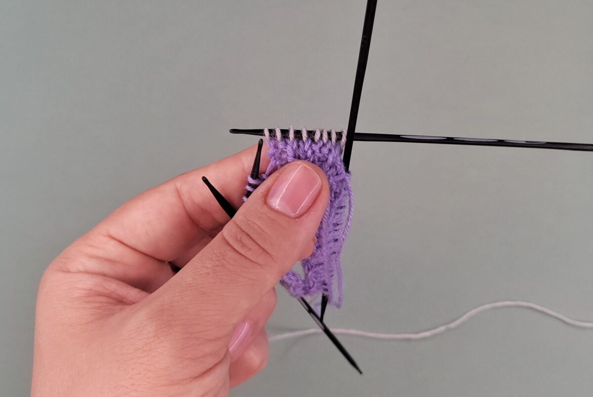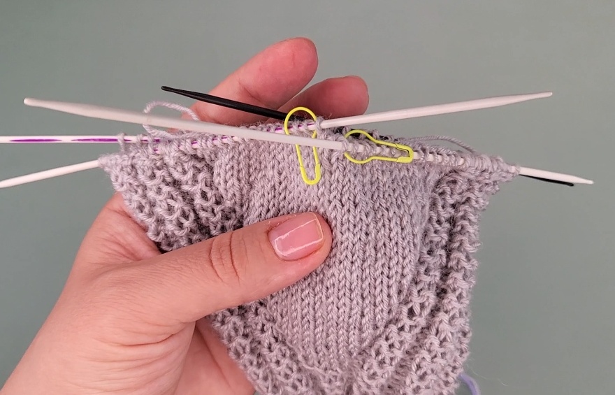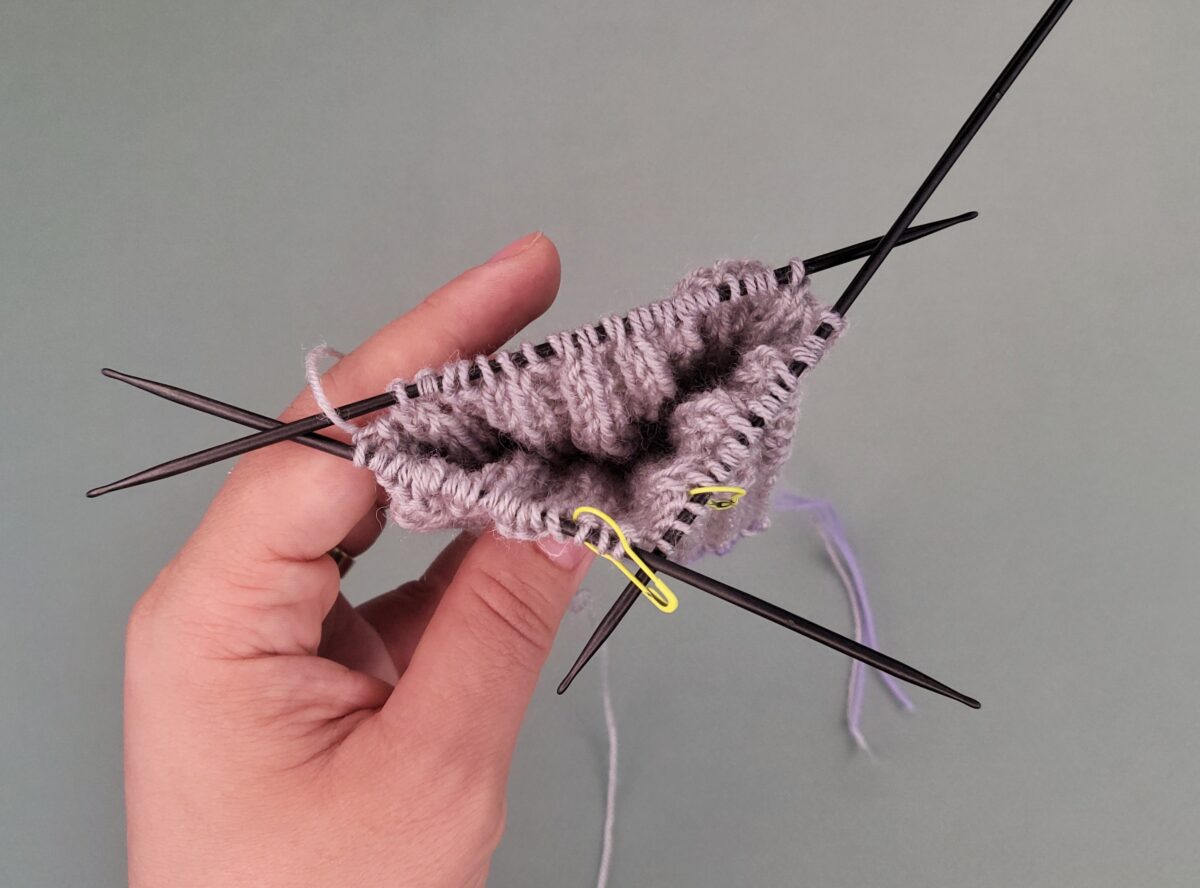 Zieht eine Nadel heraus und verteilt die Maschen auf drei Nadeln.
