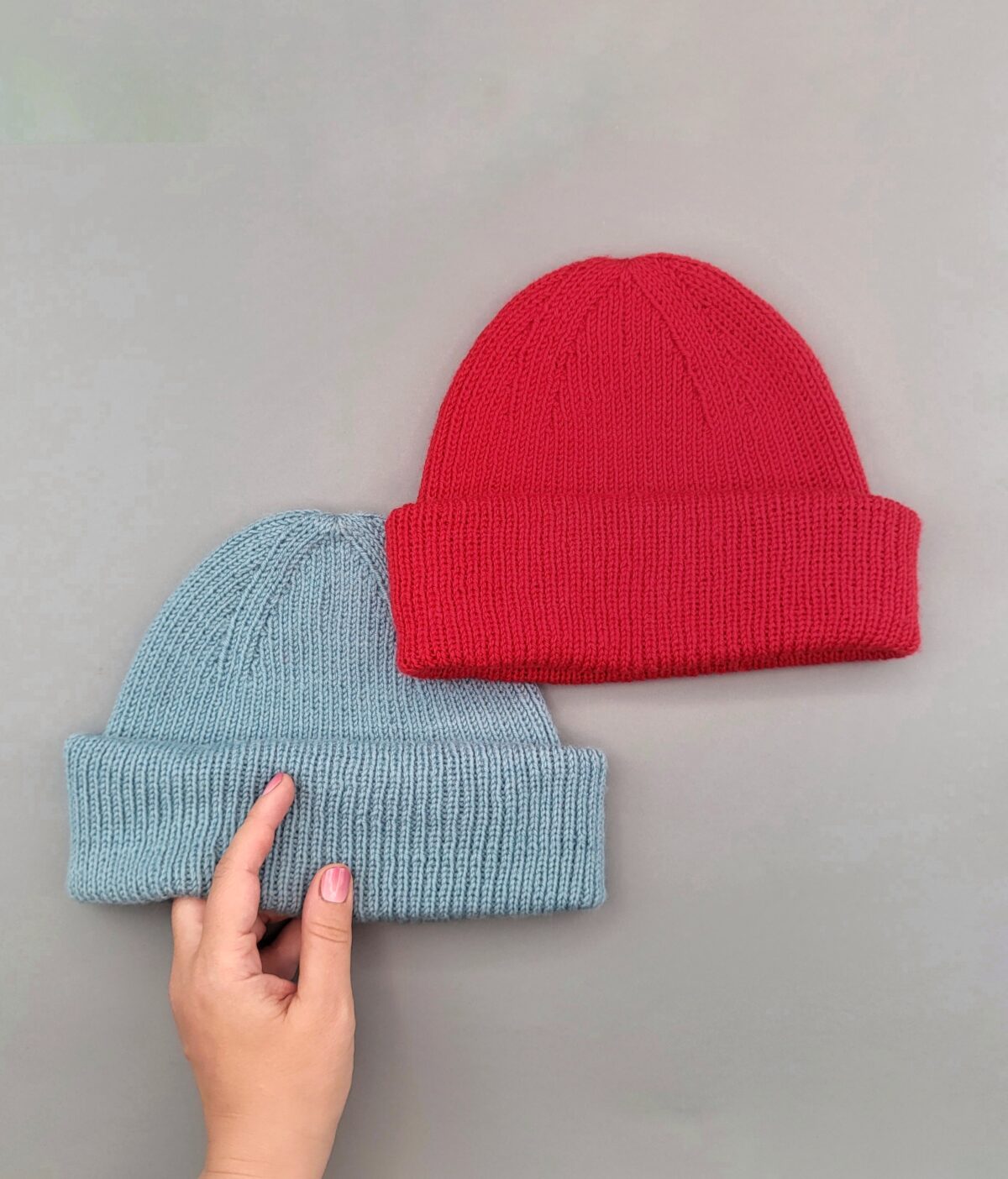 Die Rippemützen habe ich für eine Kopfumfang von etwa 56-58 cm gestrickt. Die graue Mütze hat eine Gesamtlänge von 29 cm und wiegt 55g. Die türckise Mütze hat eine Gesamtlänge von 33 cm und wiegt 68g. Die Rote Mütze hat eine Gesamtlänge von 35cm und wiegt 71g.