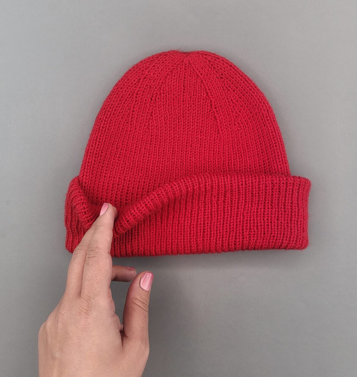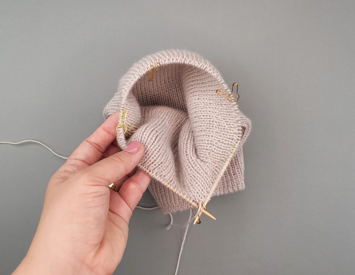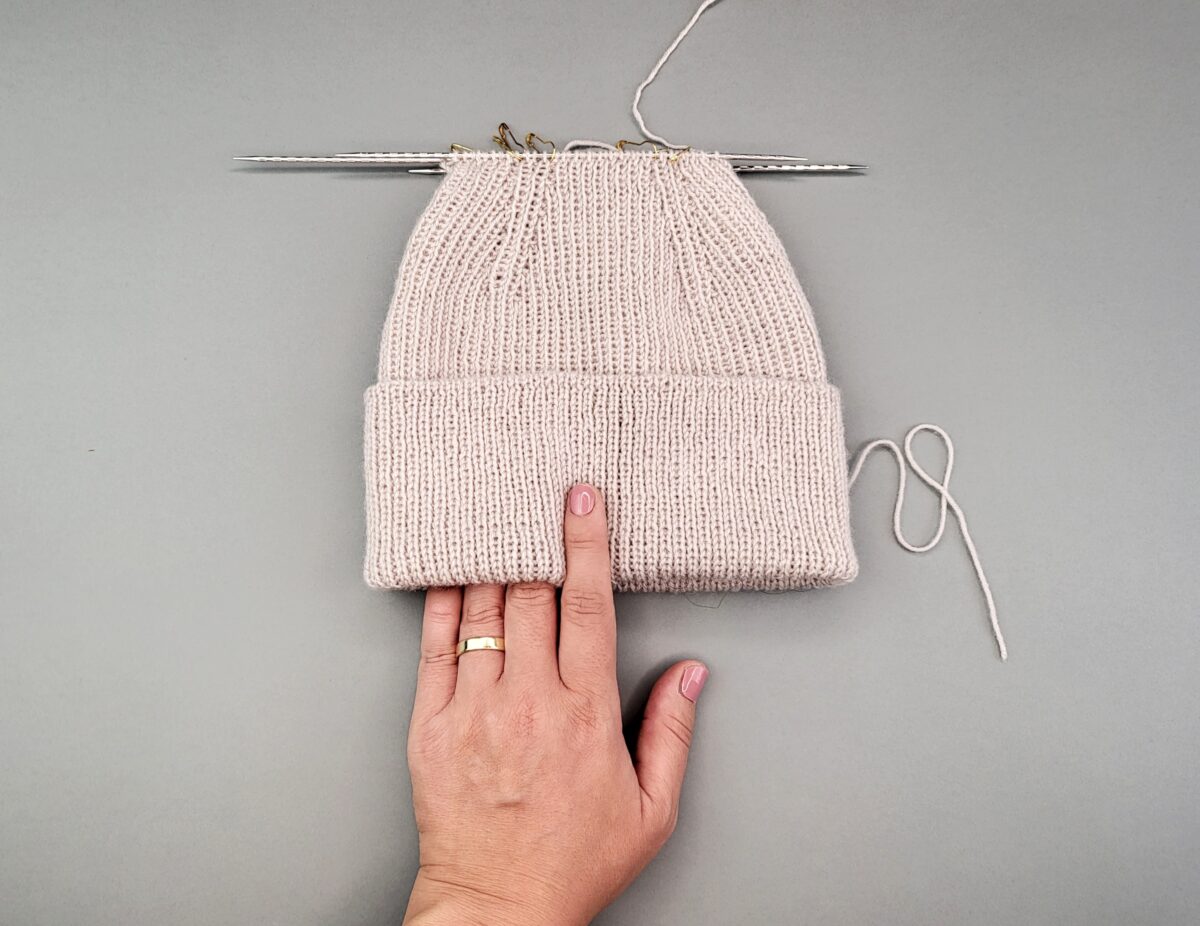 Für eine Mütze ohne Krempe strickt ihr etwa 13-15 cm. Für eine Mütze mit einer umgeschlagenen Krempe strickt ihr ca.20 cm und für eine Mütze mit doppelllagiger Krempe strickt ihr 26-28 cm Schlauch.