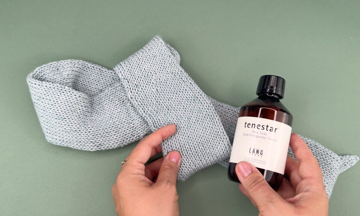 Wascht den Schal mit einem Feinwaschmittel in der Handwäsche. Ich benutze das Tenestar von Lang Yarns* speziell für Seide und Mischgewebe.