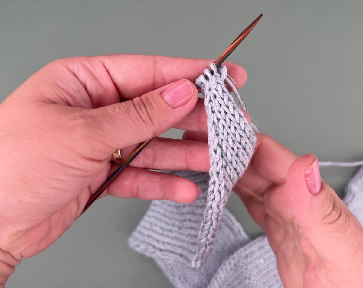 5.R: 1 M abheben, 1 M rechts stricken, 1 M abheben FlvM, mit der Maschennadel von vorne unter den Querfaden stechen und diesen auf die Maschennadel heben, nun aus dem Querfaden eine verschränke rechte M stricken, 1 M rechts stricken.